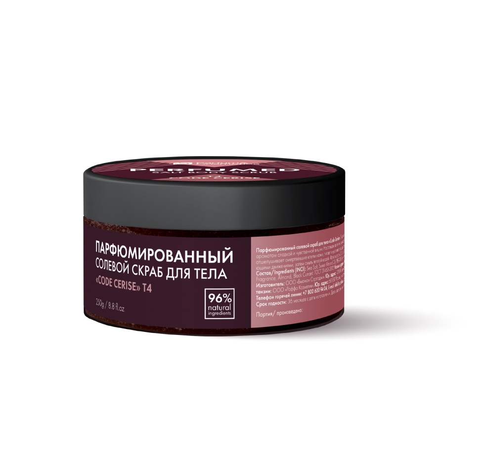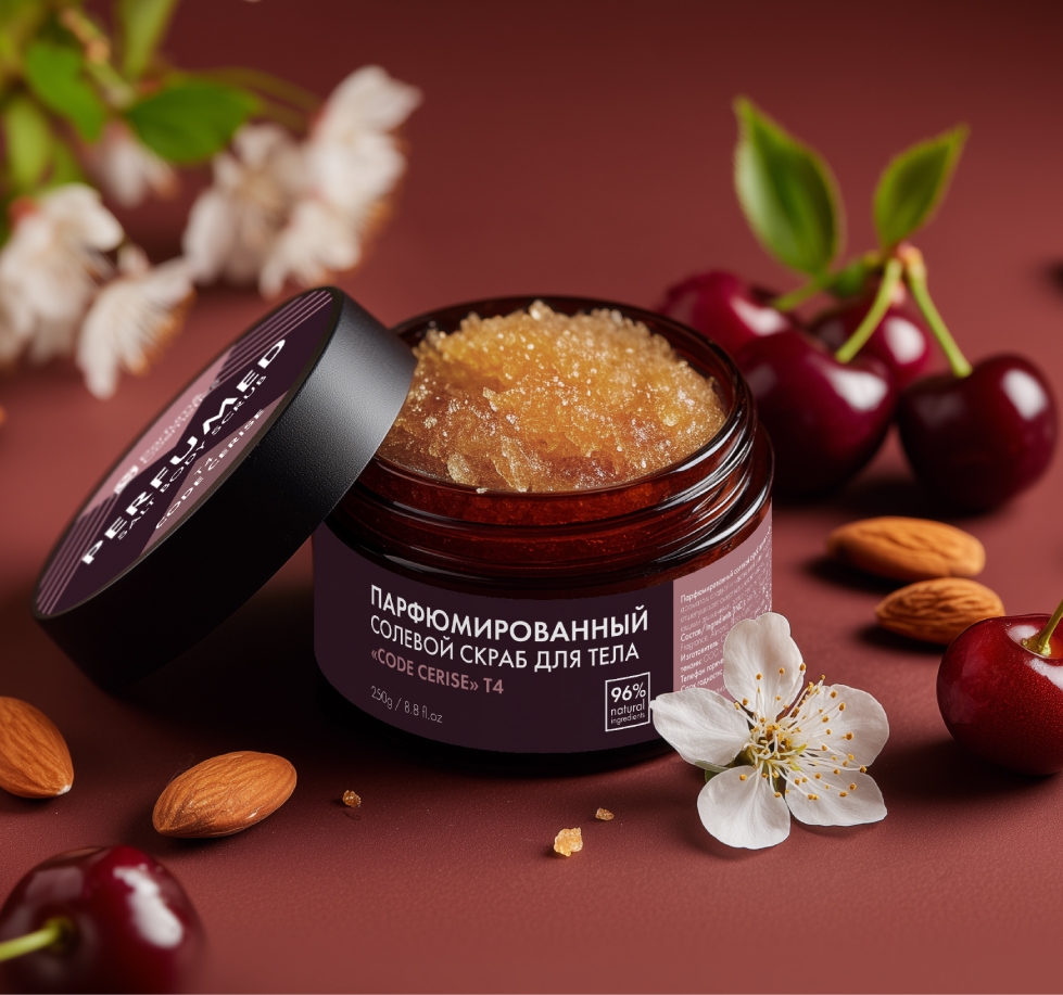 Получите удовольствие от любимого парфюма с помощью парфюмированного скраба для тела «Code cerise»,обладающего ароматом сладкой и чувственной вишни.Он будет сопровождать ваше тело невидимой дымкой чувственного облака. Настоящий аргентинский какао и кофеин обладают выраженным антицеллюлитным эффектом, повышает тонус и упругость кожи. Гранулы морской соли бережно удаляют чешуйки ороговевших тканей, массируют и тонизируют кожу. Масла миндаля, макадамии и какао питают и увлажняют.